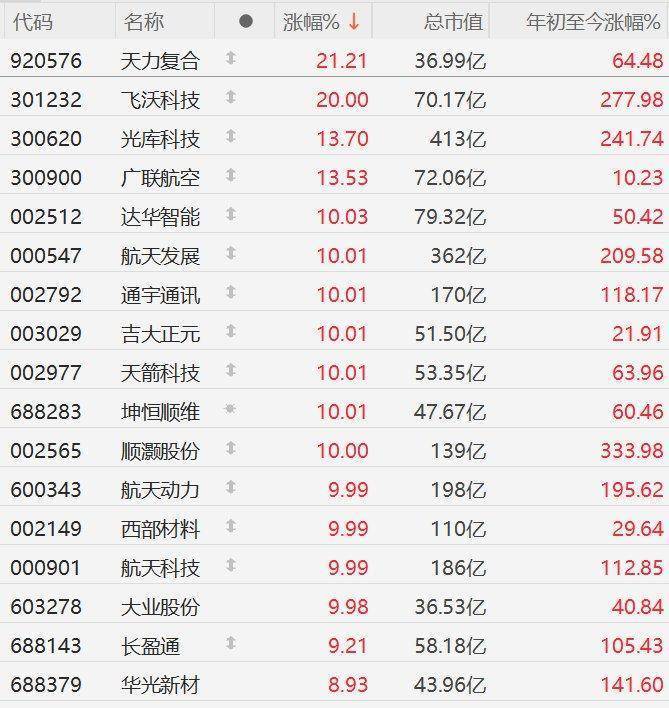 A股市场商业航天股掀涨停潮,截至半日收盘,天力复合涨超21%,飞沃科技20CM涨停,光库科技、广联航空涨超13%,达华智能、航天发展、通宇通讯、吉大正元、天箭科技、坤恒顺维、顺灏股份、航天动力、西部材料、航天科技、大业股份10CM涨停,长盈通涨超9%,华光新材涨近9%。消息面上,12月6日15时53分,我国在海南商业航天发射场使用长征八号甲运载火箭,成功将卫星互联网低轨14组卫星发射升空;12月5日17时00分,我国在酒泉卫星发射中心使用快舟一号甲运载火箭,成功将交通VDES卫星A星、B星发射升空。国泰海通证券分析师周天乐表示,太空资源竞争背景下,我国进入卫星互联网加速组网期。卫星互联网作为具备高技术、重资本、大应用场景等特点的行业,在国家研发实力、经济规模、市场需求等环节的推动下,未来基本只剩下中美具有竞争能力。中国依靠GW星座和千帆星座等组网计划已规划超2.5万颗卫星的发射目标,且商业航天作为国家重点培育的新质生产力方向,经过数年的筹备和孕育,已经逐步进入快速组网期。