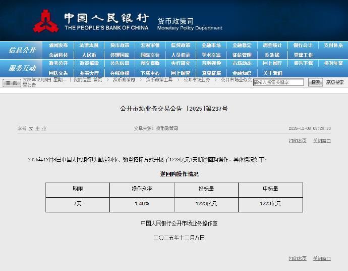 央视网消息:据央行官网消息,2025年12月8日中国人民银行以固定利率、数量招标方式开展了1223亿元7天期逆回购操作。